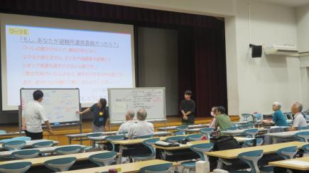 本講座では、受講生が2つのグループに分かれ、避難所の運営委員を体験するワークショップを行いました。避難所で起こりうる問題に対して運営側として、どのような解決策が考えられるか、グループごとに話し合い発表しました。