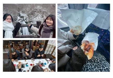 午後はフリータイムとして、グループに分かれて昼食や秋保散策を行いました。昼食で訪れた秋保パン食堂「コッペ」では、種類豊富なメニューに迷いながらも、注文を受けてから作られる温かいコッペパンを味わい、その美味しさに皆が笑顔になりました。また、秋保工芸の里にある「玩愚庵こけし屋」では、お世話になった先輩方への感謝の気持ちを込めて、こけし作りを体験しました。一つひとつ想いを込めて制作し、可愛らしいこけしが完成しました。