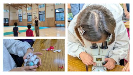 続いて、拾った種を顕微鏡で観察し、種のつくりや仕組みについて学びました。