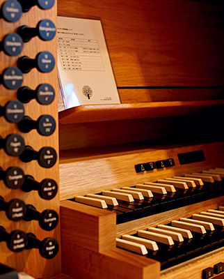 ドイツのクラッセン社のパイプオルガンは、礼拝堂のデザインにあわせたユニークな形状で、その輪郭が尚絅学院のSを彷彿させます。高さ8.8mものオルガンから豊かな音がふりそそぎます。
