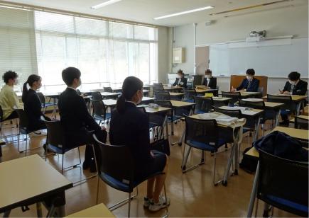 内容は主に集団面接をテーマとし、面接時のマナーや入退室、話し方のコツなどのレクチャーの後、3・4人のグループに分かれて模擬面接を行いました。