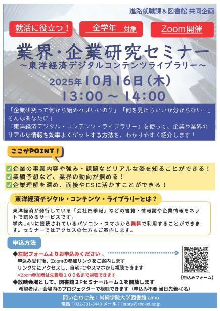 進路就職課・図書館共同企画として、「就活に役立つ! 業界・企業研究セミナー~東洋経済デジタル・コンテンツ・ライブラリー~」を以下の日時にZoom開催します。