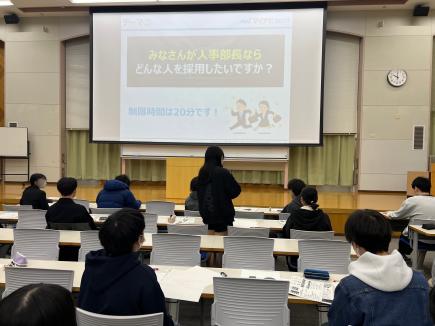 後半では、実践経験を積むために、各グループで模擬討論を2回実施しました。2回目のディスカッションは、実際の採用試験をイメージし「人事部長ならどんな人を採用したいか?」をテーマに話し合い、代表グループによる成果発表も行いました。学生たちは、座学で学んだ議論の進め方や採用側の視点を意識しながら、時間内にグループの成果を導くことができました。また、演習後には、株式会社マイナビの方から各班こまやかなフィードバックをいただきました。