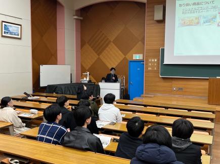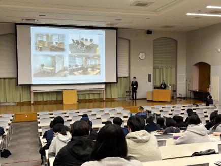 3年生を対象に、4月から通年で実施している授業科目「キャリアアップセミナー」。前期に行った企業講話に続き、後期授業でも業界や仕事理解を深めるために、学類ごとに分かれて企業の方々から講話をいただきました。