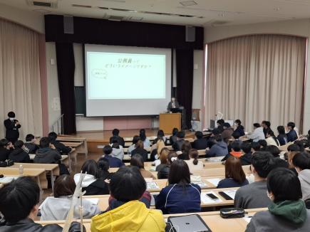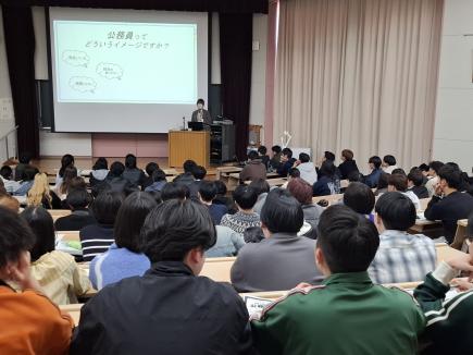 「2・3年生対象 行政・警察官希望者向け」「2~4年生対象 公務員保育士・管理栄養士希望者向け」のガイダンスでは、公務員試験の全体的な流れや試験区分ごとの配点、具体的な学習方法や対策について説明がありました。 また、「1年生対象」のガイダンスでは、公務員の主な職種やその特徴、試験の概要に加え、今から取り組める試験対策について解説していただきました。