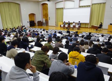 先輩方は「企業研究をしっかりすること」「SPIは学内講座を受講するなど、早めに対策を始めること」「面接は場数を踏むことが大切。進路就職課での練習が大変役に立った」などを自らの経験を伝えていました。