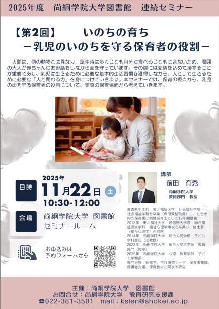 今年度は「いのちの教育」がテーマになっており、4回の連続セミナーのうち、第2回目の11月22日(土)は、元保育士の現場経験をもつ子ども学類教員の前田有秀(教授)が講師を務めます。