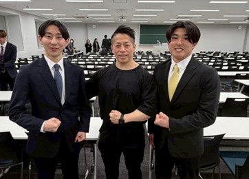 (左から)私、岡田隆氏:日本体育大学体育学部教授(ボディビルダー)、 加藤多雄宇(ゼミ生)