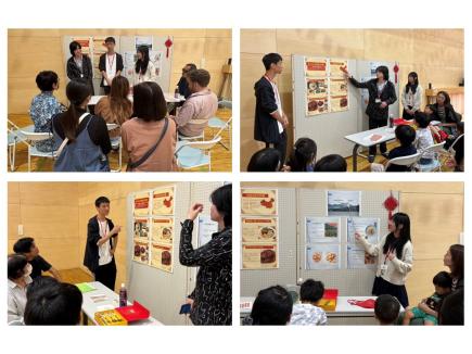 アイスブレイクの後は、それぞれの国のブースに分かれて出身国の文化紹介タイムとなりました。中国のブースでは、本学の交換留学生3名が中国の地方料理、なかでも特に河南省の烩麺(羊や豚などを煮込んだスープを使った麺料理)、江蘇省無錫の醤排骨(豚のスペアリブを醤油ベースのタレで煮込んだ料理)、杭州の龍井蝦仁(海老の龍井茶炒め)について紹介しました。聞きに来てくれた一般参加者からは、中国料理や中国の文化について質問があがり、3人は丁寧に回答をしていました。