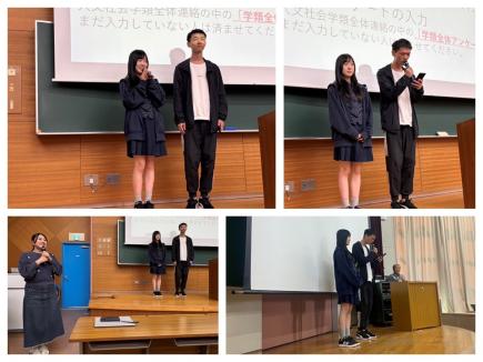一般学生向けのオリエンテーションでは、教室いっぱいの学生を前日本語で自己紹介をしました。緊張しながらも、完璧な日本語で日本留学の動機や留学期間中に学びたいことについて発表をしました。