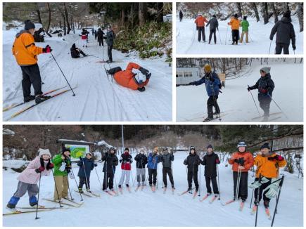 昨年に引き続き、人文社会学類のパトリック・カナウェイ先生がインストラクターとしてラングラウフスキーを指導しました。学生たちはスキー板の扱い方や基本的な滑走方法を学んだ後、実際のコースに進みました。最初はバランスに苦戦する場面も見られましたが、「膝を落として」「重心を前に」など、声を掛け合いながら挑戦することで、次第にスムーズに滑れるようになっていきました。