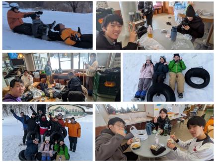 午前中にラングラウフコースを回った後は、山形少年自然の家サービスセンターで昼食をとり、ストーブの火で身体をあたためました。その後、再びゲレンデに出てチューブ滑りを楽しみました。しばらくすると3つ、5つとチューブを連結して滑るグループも現れ、勢いよく滑り降りるたびに歓声と笑い声が響き渡りました。チューブ用のコースは途中で大きく蛇行しているため滑降スピードが上がり、学生たちは大興奮で冬ならではの遊びを存分に楽しんでいました。