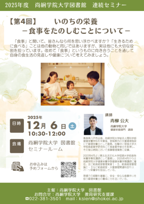 第4回目は12月6日(土)いのちの栄養「-食事をたのしむことについて-」というテーマで本学健康栄養部門 講師 青柳公大が講師を務めます。