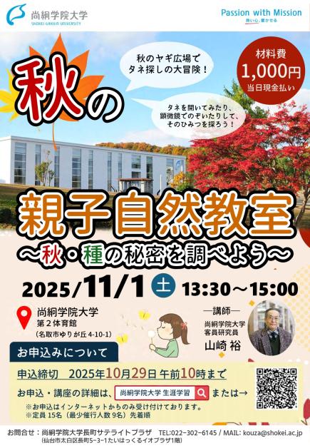 地域連携センターでは「秋の親子自然教室」の参加者を募集中です。