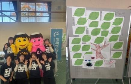 当日は健康栄養学類の山城准教授と学生5名が町民体育館のブースに出展し、地域のみなさんと交流をしました。 今後どのようなな活動ができるか、参加者のみなさんからのメッセージを木の葉に記入していただき、ボードに貼り付けて、みなさんの希望が詰まった木が完成しました。