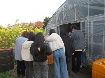 広大な農園には、いちじくやゆずの木が立ち並び、ビニールハウス内では春菊や雪菜が丁寧に育てられていました。学生からは「木に生っているいちじくを見るのは初めて」という声も聞かれました。