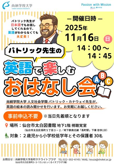 11月16日(日)、人文社会学類教員のパトリック・カナウェイ先生による絵本読み聞かせイベント「英語で楽しむおはなし会」が太白図書館で行われました。 当日は長町地域や名取市から来られた2歳~小学校低学年のお子さんや保護者の皆さん、太白図書館のスタッフの皆さまなど20名ほどが参加しました。