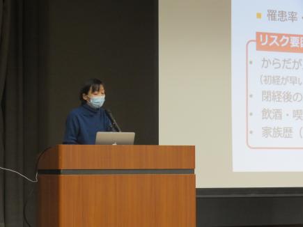 はじめに、宮城県対がん協会の方より、乳房の状態を日頃から意識し、変化に気づいたら受診につなげる「ブレスト・アウェアネス」の重要性についてお話いただきました。普段の状態を知っておくことが、乳がんの早期発見につながるということを、具体例を交えながらご説明いただきました。