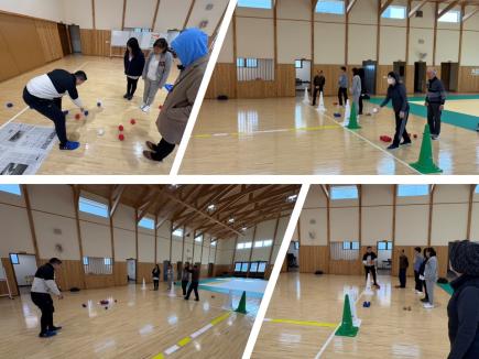第2部では「運動について知ろう!」をテーマに、芸術・スポーツ部門の竹内孝文講師が担当し、 「運動の効果」と「基礎運動能力」に焦点をあてて、簡単な運動やクイズを間に挟みながら運動がもたらす効果と基礎運動能力の関係について説明がありました。後半は、体育館のアリーナに出て参加者全員でボッチャを体験しました。 ボッチャは、年齢や性別、障害の有無にかかわらず楽しめるスポーツで、ジャックボール(目標球)と呼ばれる白いボールに味方のボールをどれだけ近づけられるかを競うスポーツです。最初はなかなか思うところにボールが届きませんでしたが、プレイするうちに参加者同士が声を掛け合いながらボッチャを楽しむ様子が見られました。