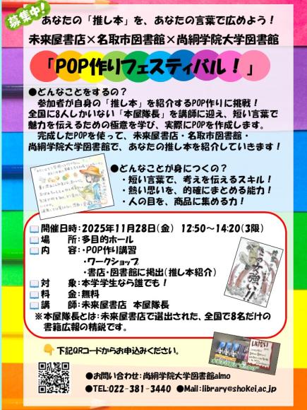 図書館では、このたび、学生・院生を対象した「POP作りフェスティバル! 未来屋書店×名取市図書館×尚絅学院大学図書館」を開催します。